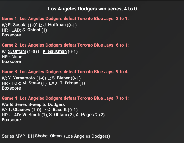 Welp… sorry Blue Jays fans. The Dodgers sweep with Ohtani being the MVP after going 7-for-13 with 2 solo home runs for a .538/.625/1.077 triple-slash. He also threw 8 innings of 1-run ball with 9 strikeouts and a win in game 2.